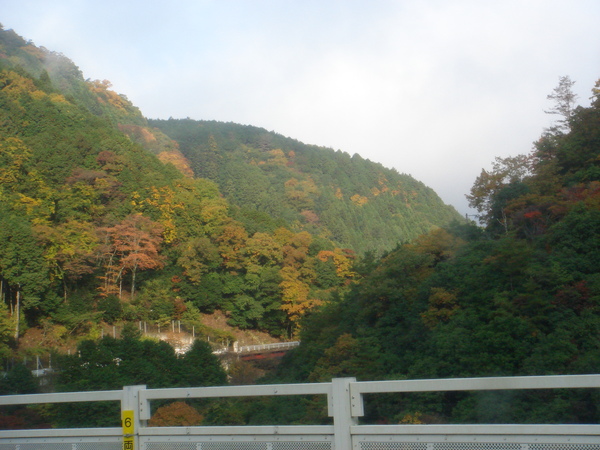 在從JR嵯峨嵐山往馬堀的途中,窗外仍是豔陽高照,這一片山一叢紅、黃、綠挺漂亮的